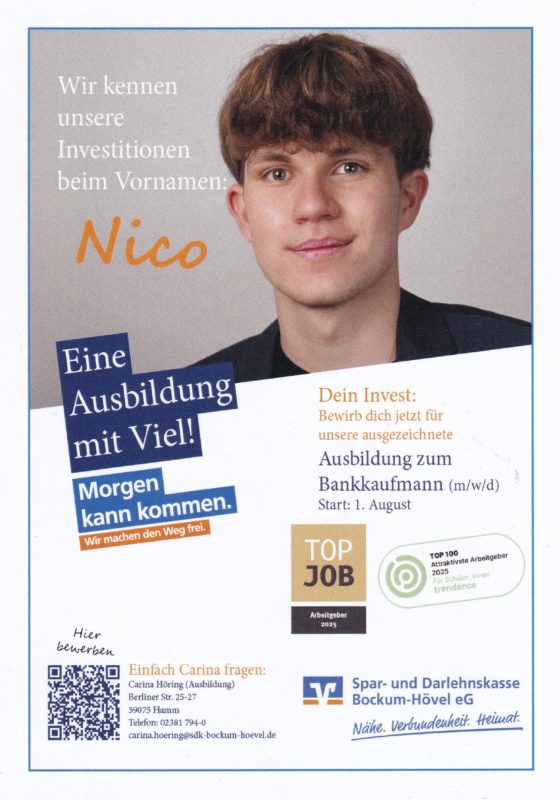 Das „Gesicht“ der Ausbildungskampagne 2025/2026 von der Spar- und Darlehnskasse Bockum-Hövel eG